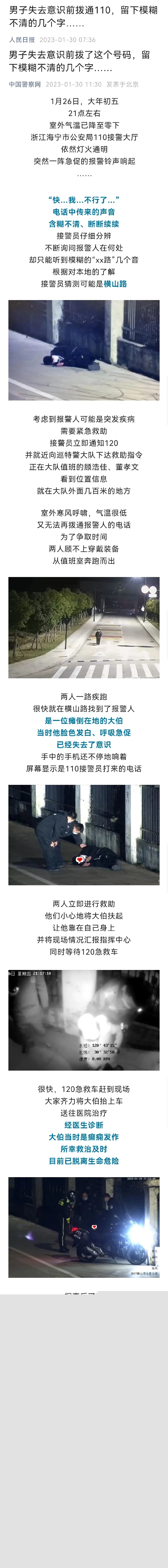 近日,嘉兴海宁市公安局接到报警求助,报警人声音含糊不清,只能听到模糊的“xx路”几个音。接警员猜测可能是横山路,立即拨打120,民警到场后发现报警人瘫倒在地,已经失去了意识,小心地将大伯扶起,众人合力将大伯抬上车送往医院。经诊断,大伯是癫痫发作,昏迷前拨打了110,所幸救治及时,目前已脱离生命危险。人民日报、中国警察网、中国普法、中国反邪教、平安鼎、浙江公安等央省级媒体为在“蛛丝马迹”中准确辨出位置的接警员和出警民警点赞!